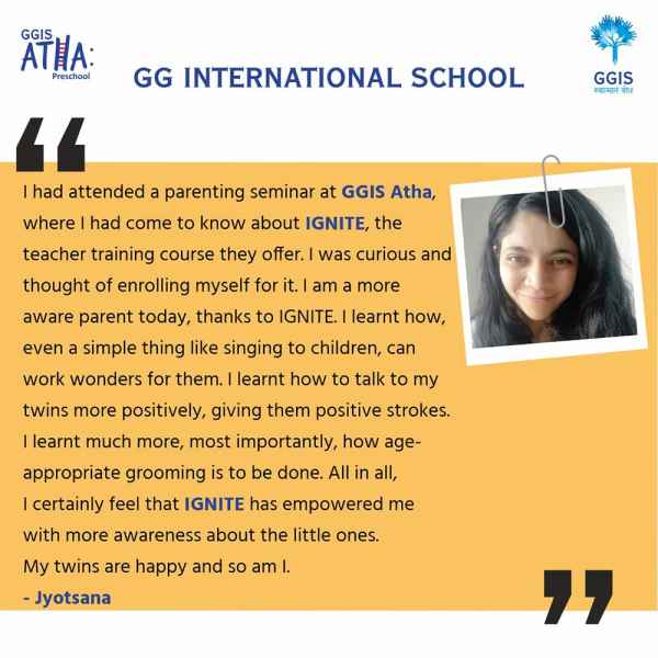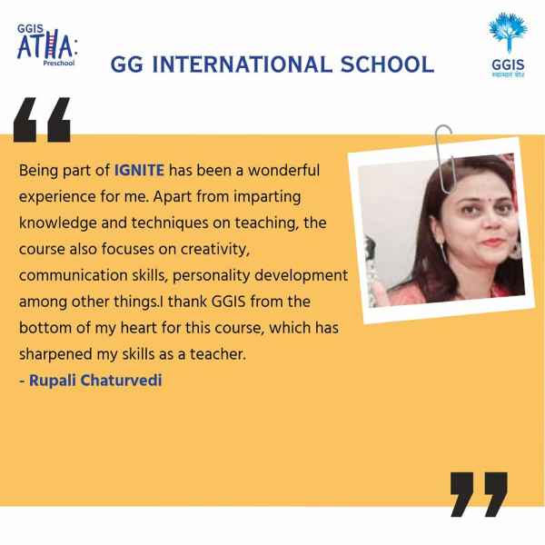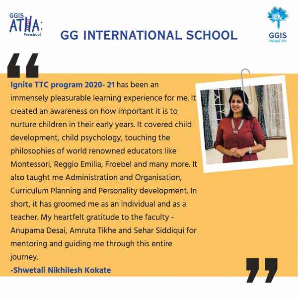 Enroll in the Premier Pre-Primary Teachers' Training Academy in Pune Our comprehensive course delves deeply into pertinent theoretical subjects. The curriculum covers both conceptual topics and applied aspects related to preschool management and the curriculum. Striking a harmonious balance between theory and practice, our program's practical component includes supervised teaching. Trainee educators actively participate in planning and executing routine and innovative curriculum activities in a school setting. Under the expert guidance of experienced faculty members, this supervised teaching hones necessary skills and instills confidence. Trainees also learn to craft creative teaching aids during their practical training. Our training institute has been pivotal in preparing educators for preschool teaching, catering to the age group of three to six years. These formative years are crucial and influential, laying the foundation for later learning. Our core objective is to equip teachers to meet the challenges of fostering all-round development in growing children. Guest lectures and interactive workshops are integral to our curriculum. Experts in Early Childhood Education conduct these workshops, enriching the learning experience. Successful graduates of our program earn a Certificate in Early Childhood Care and Education, enabling them to teach in pre-primary schools. Our impressive placement record speaks for itself, with 100% of our graduates finding positions since the Academy's inception. Many have joined prestigious schools, while others have established their own pre-primary or daycare centers. Designed to accommodate full-time or part-time workers, home makers and students pursuing higher education, our course ensures minimal disruption to their existing schedules. Interactivity between faculty and students is emphasized, and the curriculum also caters to the needs of small rural schools. Upon successful completion of the course, graduates are awarded a Pre-Primary Teaching Certificate from Ignite Teachers' Training Academy at GG International School.